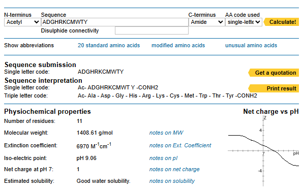Innovagen's peptide calculator makes calculations and estimations on physiochemical properties: peptide molecular weight, peptide extinction coefficient, peptide net charge at neutral pH, peptide isoelectric point,