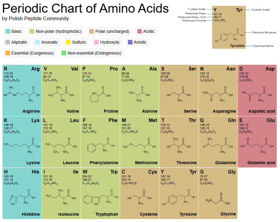 Periodic Chart of Amino Acids (PPC). This interactive chart provides basic information about 20 proteinogenic amino acids, including their structure, classification, systematic name