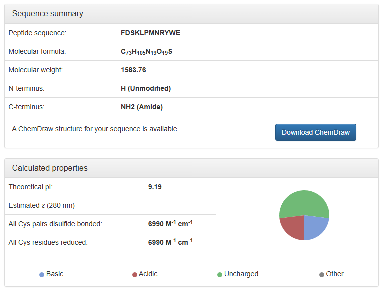 is a peptide chemical formula and molecular weight calculator and MS peak assignment tool. Where possible, Peptide Calculator will also provide estimated isoelectric point and molar extinction coefficient values for