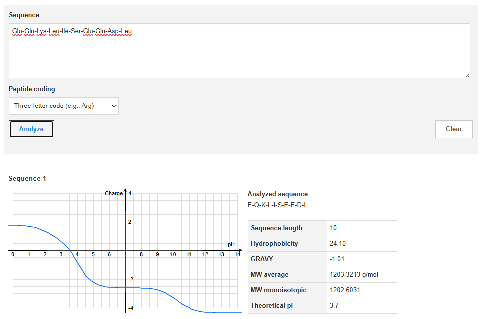 which can be used as an amino acid calculator as well. Additionally, the tool includes a hydrophobicity calculator, a net charge calculator at different pH, isoelectric point calculator and the hydrophilicity ratio.